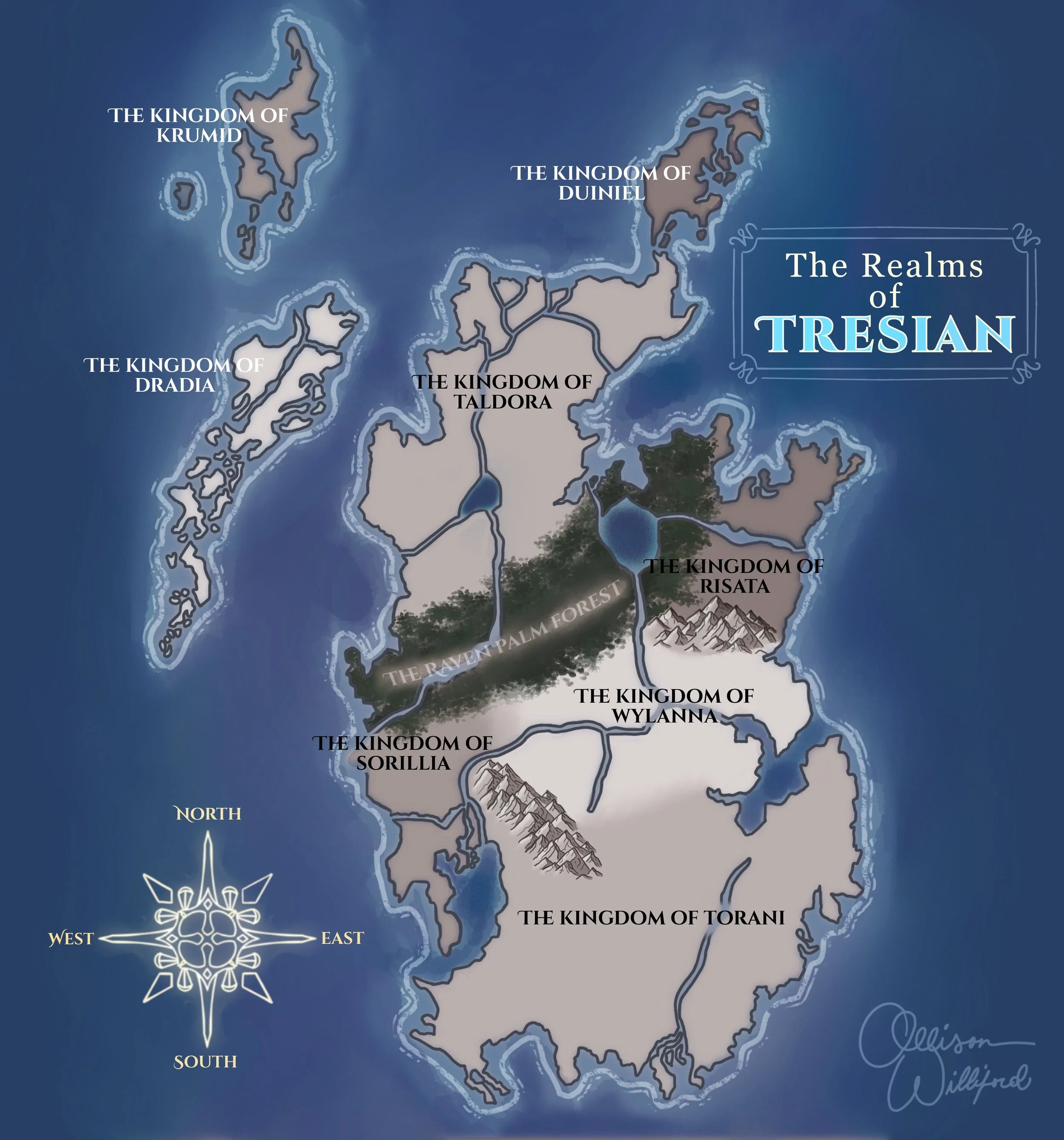 Kingdom Of Sorilla: A wild, sea-wrapped kingdom in western Tresia where strength grows tangled with beauty. Towering keeps rise from cliffs draped in ivy and salt air, their banners snapping like trapped sunlight. Sorilla is a realm of defiant grace — its people stubborn as the tide, its history knotted in secrets and storms. It’s a kingdom that does not bend; it blooms through the thorns.